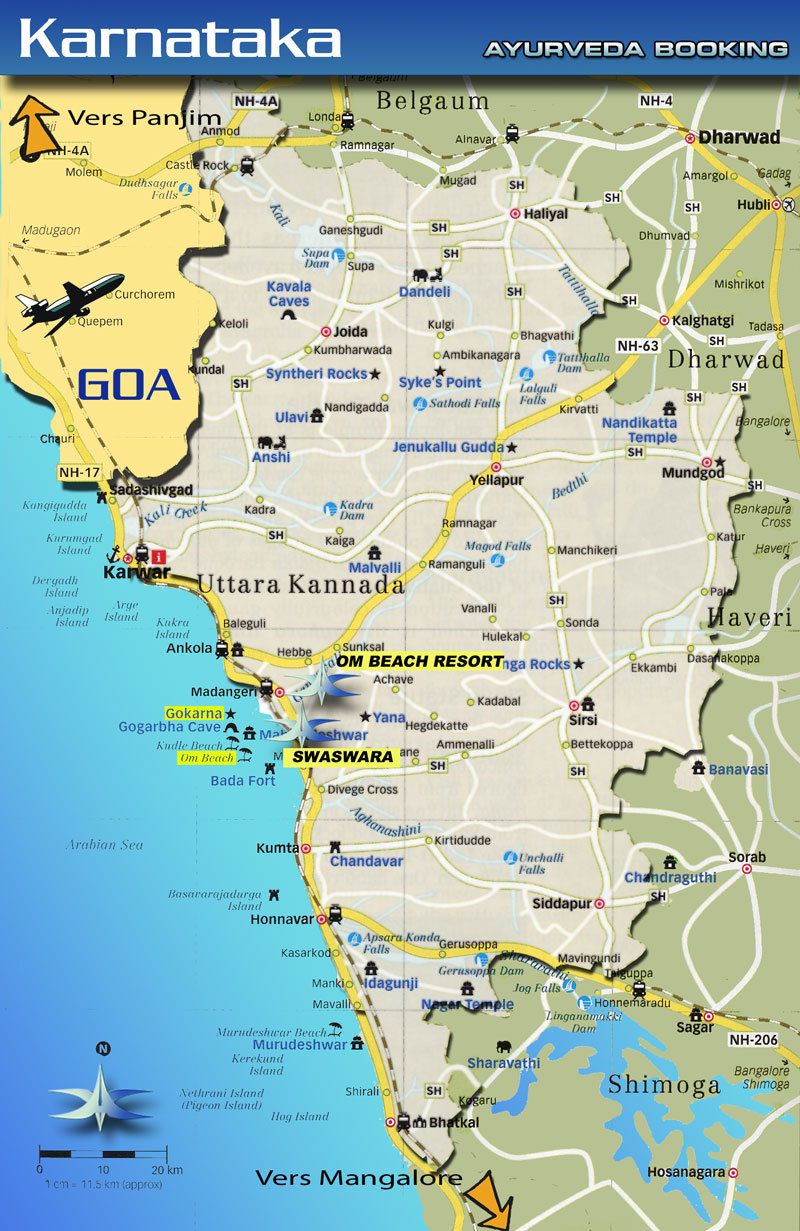 La ville de Gokarna a longtemps été un pôle d’attraction pour les pèlerins qui venaient au temple de Mahabaleshwar dédié à Shiva, mais grâce à la découverte d’une plage en forme de OM, la syllabe sacrée de l’Inde védique, les hippies sont venus nombreux, suivis par les simples touristes. Une ambiance et une nature qui font penser à Goa, un isolement des grands axes de communication, en font un lieu de repos et de dépaysement idéal. L'origine du nom de Gokarna (oreille de vache) vient d'une légende dont le démon Ravana serait la cause, lorsqu'il tenta de voler le shivalingam qui avait été enfoui par Ganesh...