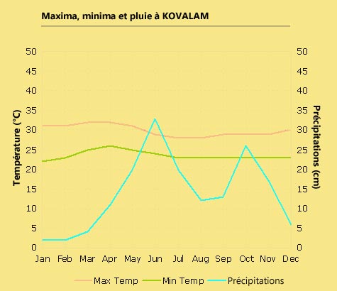 In season (except monsoon which is from June to September), one can bathe and surf (many waves, except rare sheltered corners) in tropical water. One finds in Kovalam many centers of massages ayurveda, but also of yoga schools, meditation centers. The qualities of care are diverse but if one seeks relaxation and relaxation, one easily finds happiness; for declared pathologies, it is better to go to specialized clinics, or at least centers with all the required guarantees (green or olive leaf).